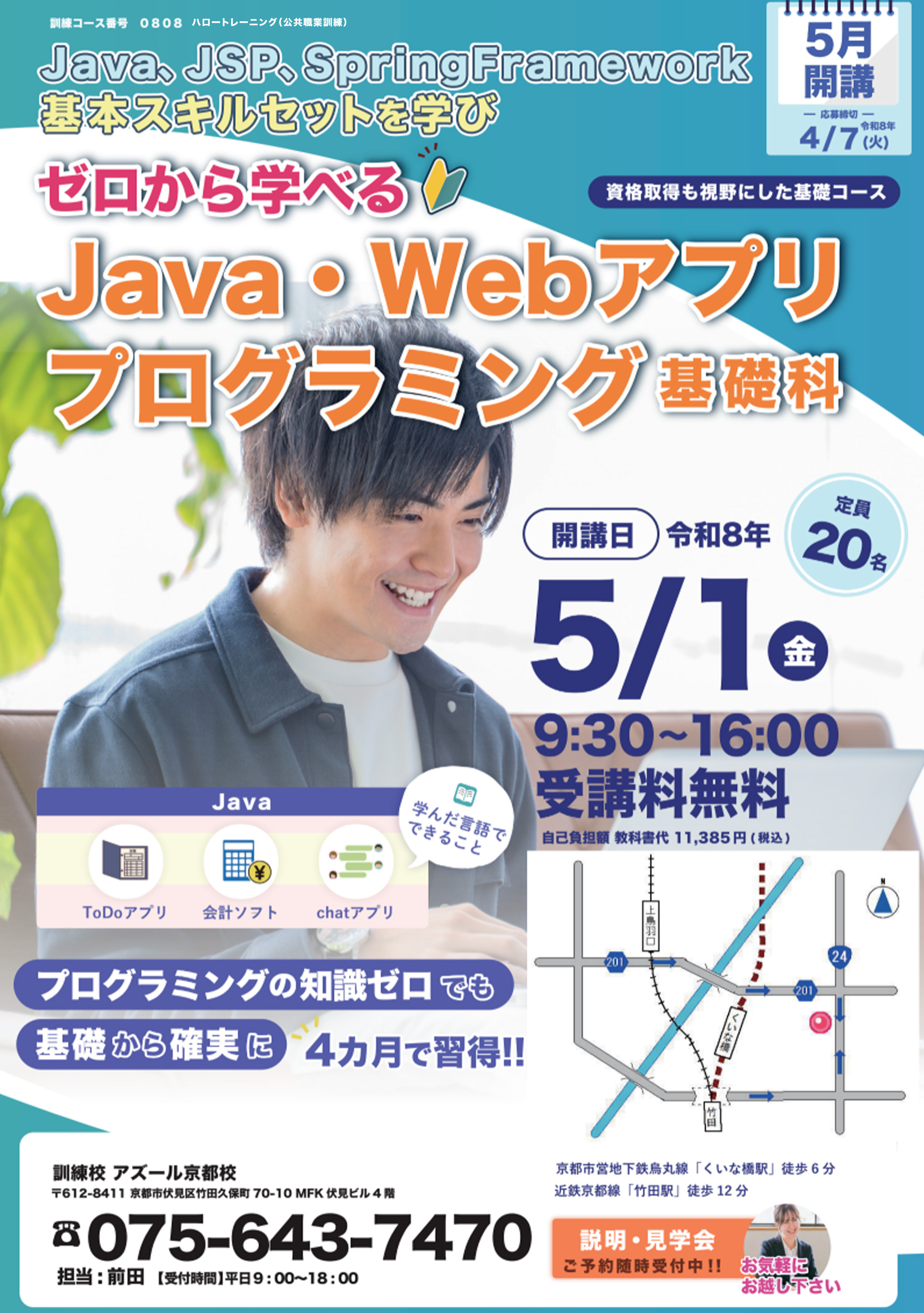 Java、JSP、SpringFrameworkで基本セットをゼロから学べるコース